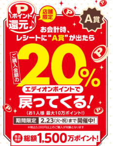 1 12 2 28 Dポイント 好評につき 第2弾 エディオン 100満ボルト対象の店舗で会計時にdポイントカードを提示で最大10万円分までレシート全額分ポイントバック実施中 おたるちゃんねる